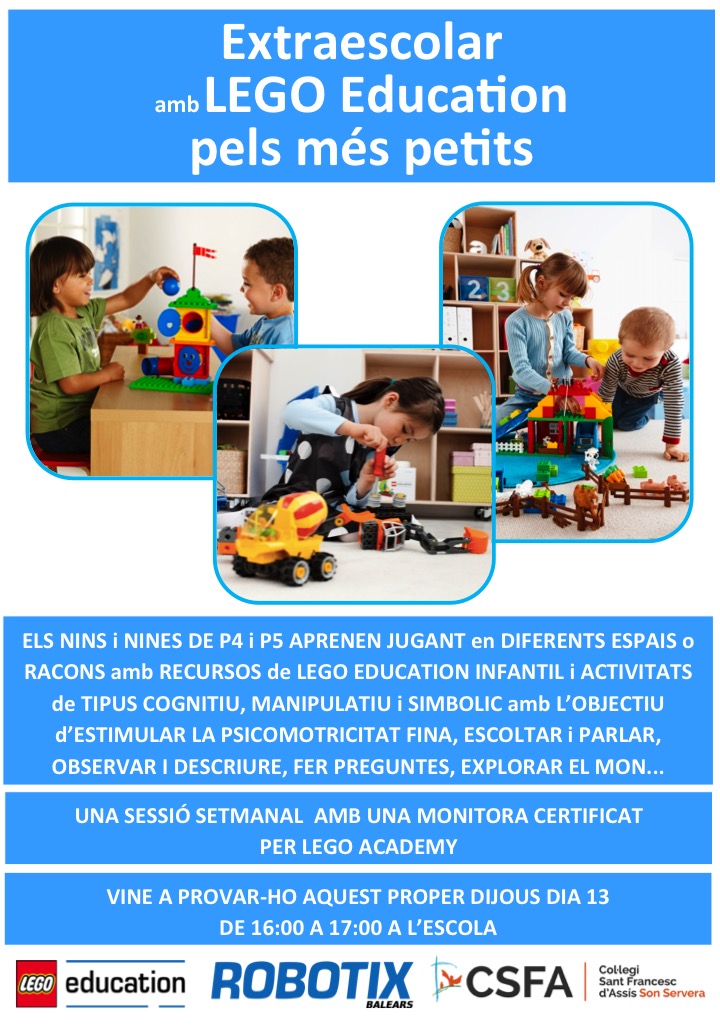 Vols conèixer en què consisteix aquestadivertida extraescolar de Robotix? Idò…… aquest dijous 13 de setembre de les 16 h a les 17 h vine a la demo que es farà al nostre Centre. En cas d’un nombre d’inscrits, es faria una sessió setmanal amb una monitor/a certificat per Lego Academy. Vos hi esperam!!!